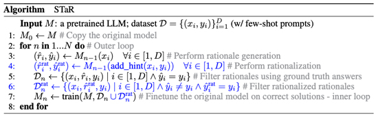 STaRは,少数の推論例を用いて多数の質問に対して推論を生成し,生成された答えが間違っていた場合は,正しい答えをもとに再度推論を生成しようと試み,最終的に正解に至ったすべての推論を基に微調整を行い,このプロセスを繰り返すというシンプルなループからなる.